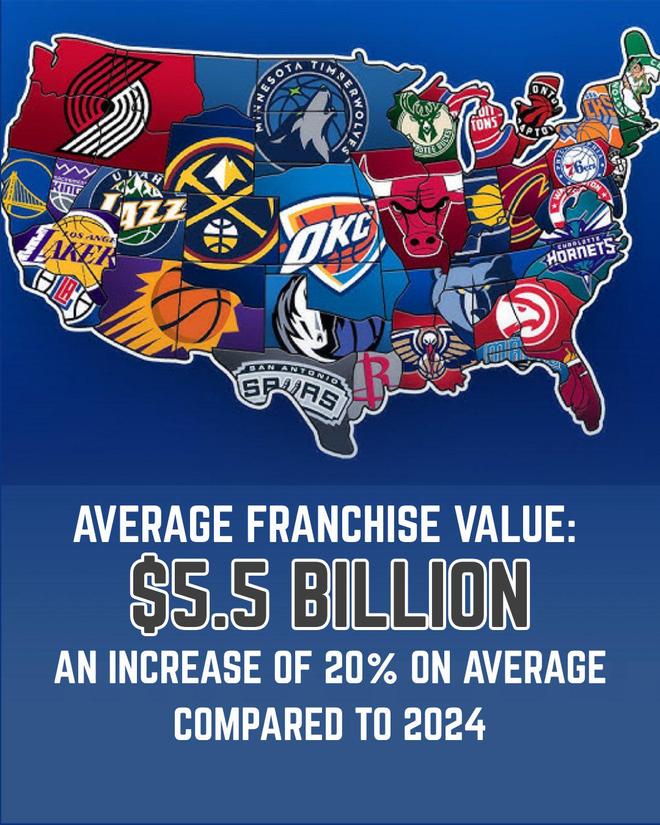 根據(jù)統(tǒng)計,聯(lián)盟各隊的平均估值為55億美元,所有球隊的總估值高達(dá)1650億美元,和去年相比增長了20%,以下是具體排名: