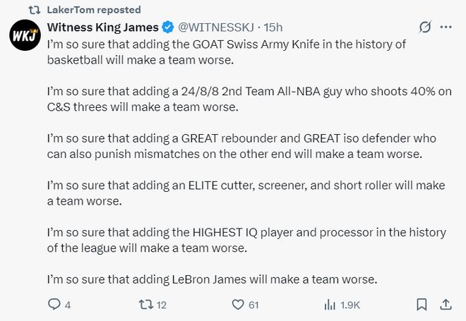 我非常確定,一支球隊加入聯(lián)盟歷史上籃球智商最高、運(yùn)算能力最強(qiáng)的球員后,這支球隊實(shí)力將大打折扣。